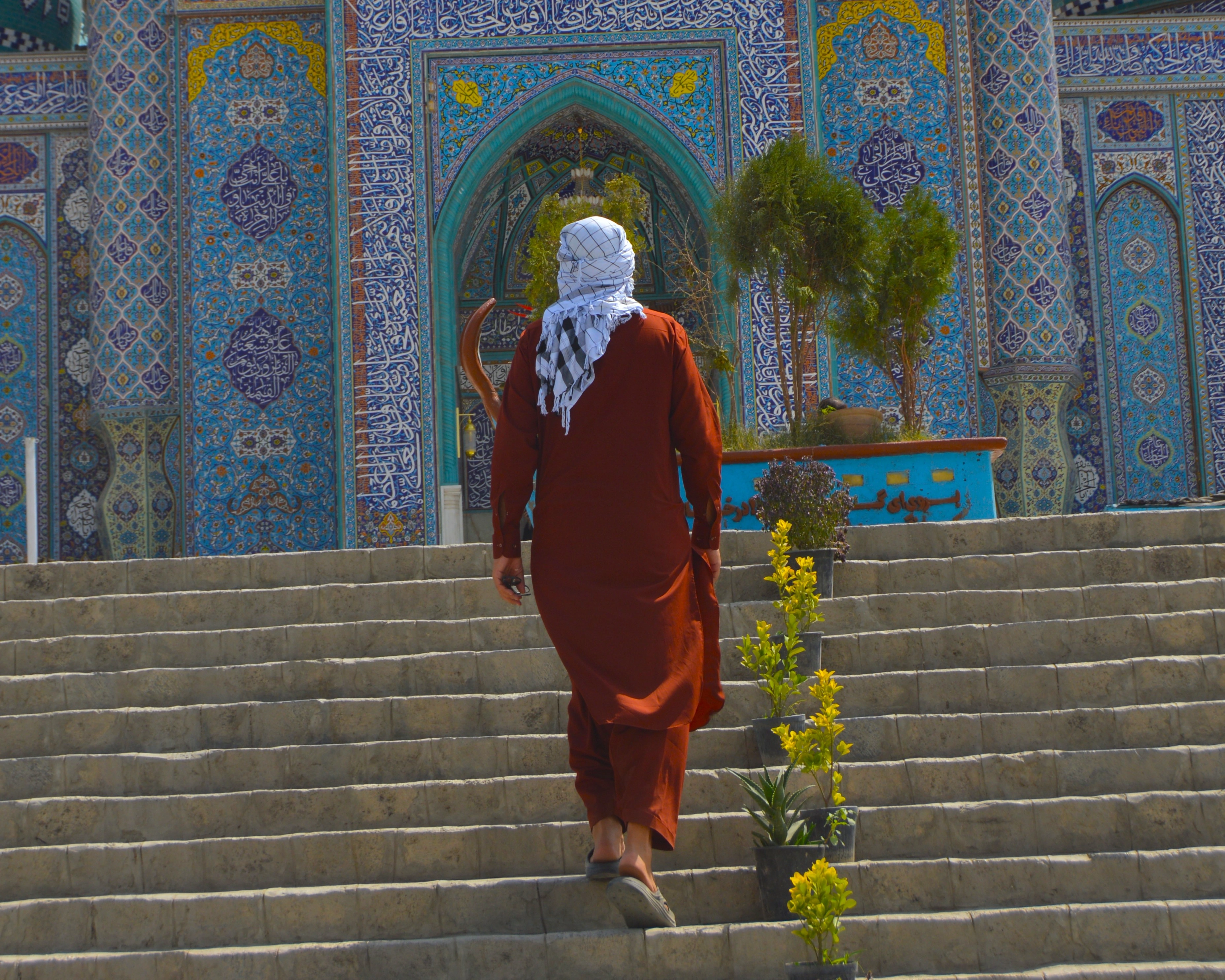 La Mezquita Hazrat Ali, conocida como la Mezquita Azul, es un templo que parece suspendido entre siglos. Un océano de azulejos turquesas, cúpulas que respiran luz, minaretes que quieren tocar el cielo. La leyenda dice que allí reposa Hazrat Ali, y el lugar se comporta como si fuera cierto: palomas que vuelan como oración viva, hombres entrando y saliendo en un flujo constante, familias sentadas en los jardines, mujeres caminando entre sombras. Es uno de los lugares más hermosos del país, no por su estética solamente, sino por cómo se siente: un refugio donde la vida cotidiana se sirve sin filtro. Entramos los tres. También Ilaria. Caminamos despacio, tratando de absorber aquella calma imposible en medio de tanto caos.