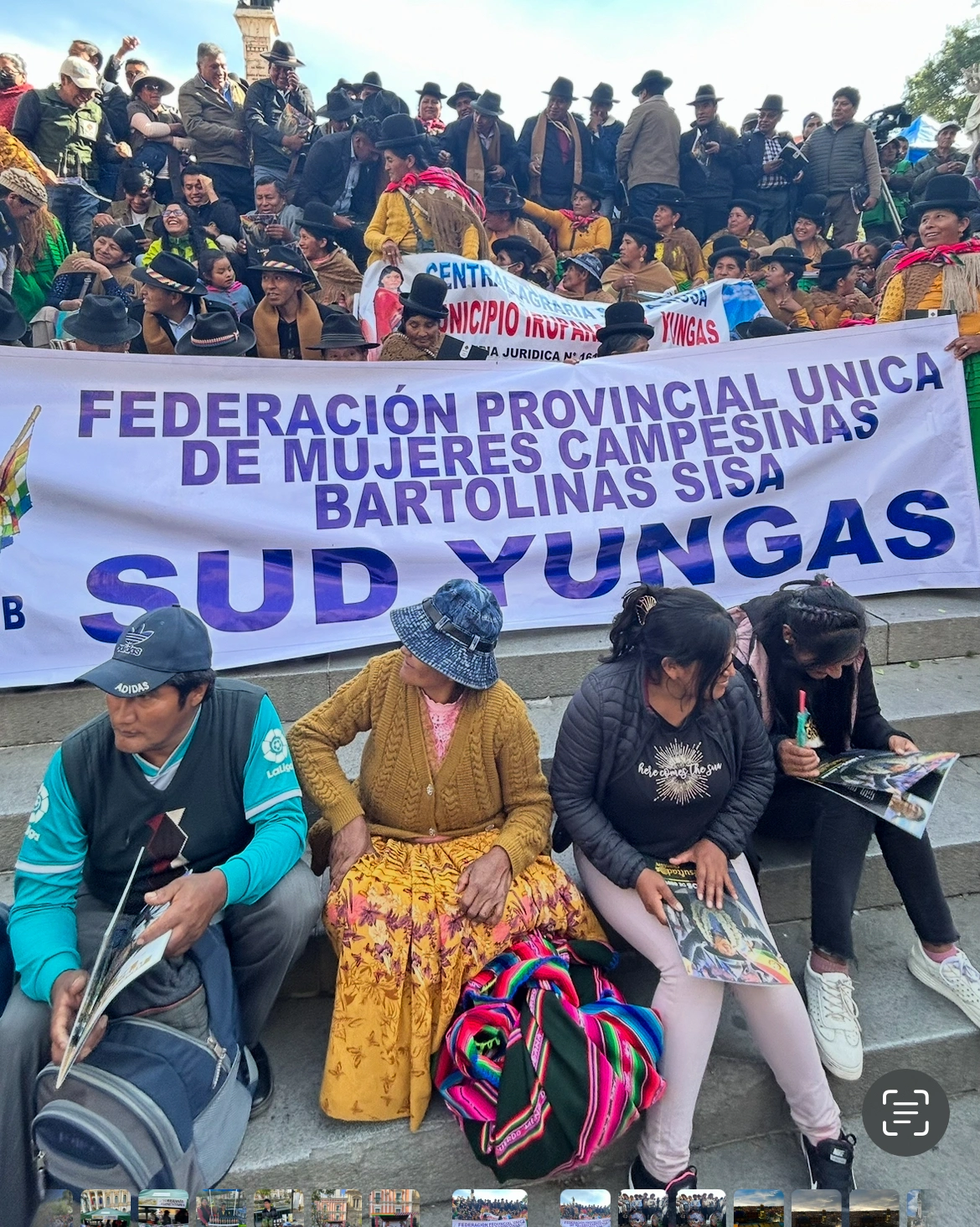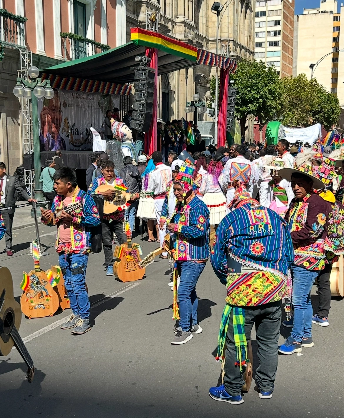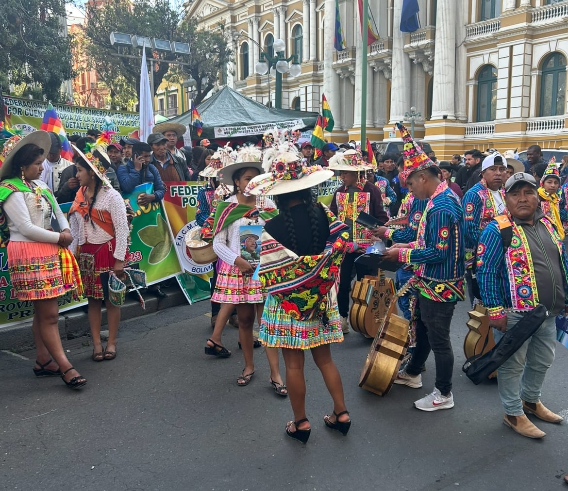 A las diez y media de la mañana la plaza Murillo ya bullía de actividad. Frente al Palacio Quemado habían levantado un escenario improvisado, rodeado de parlantes que escupían música folclórica entre prueba y prueba de sonido. Se esperaba la llegada del presidente Arce, y mientras tanto las agrupaciones campesinas, llegadas de todas las regiones del país, desplegaban sus banderas verdes y consignas con una energía que mezclaba orgullo y reivindicación.