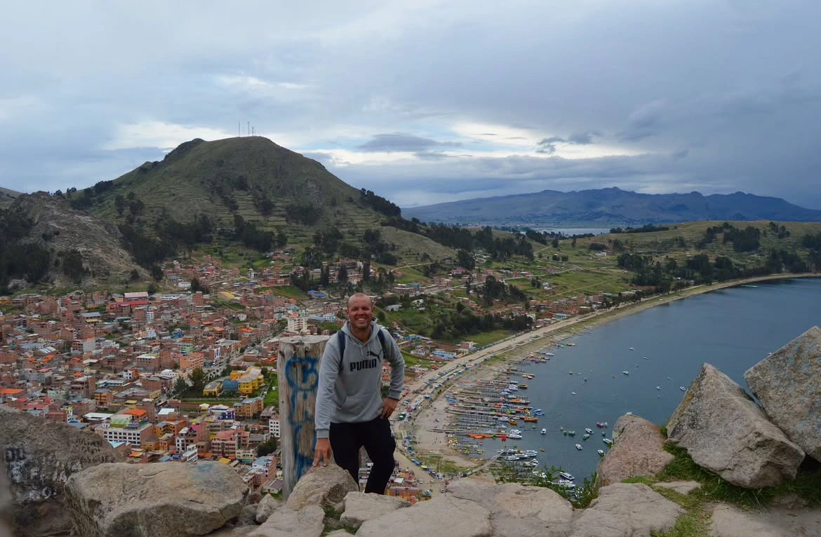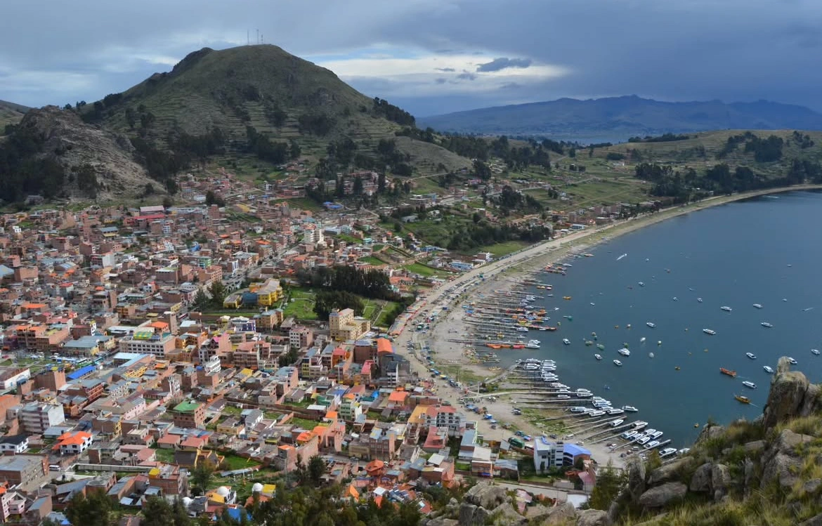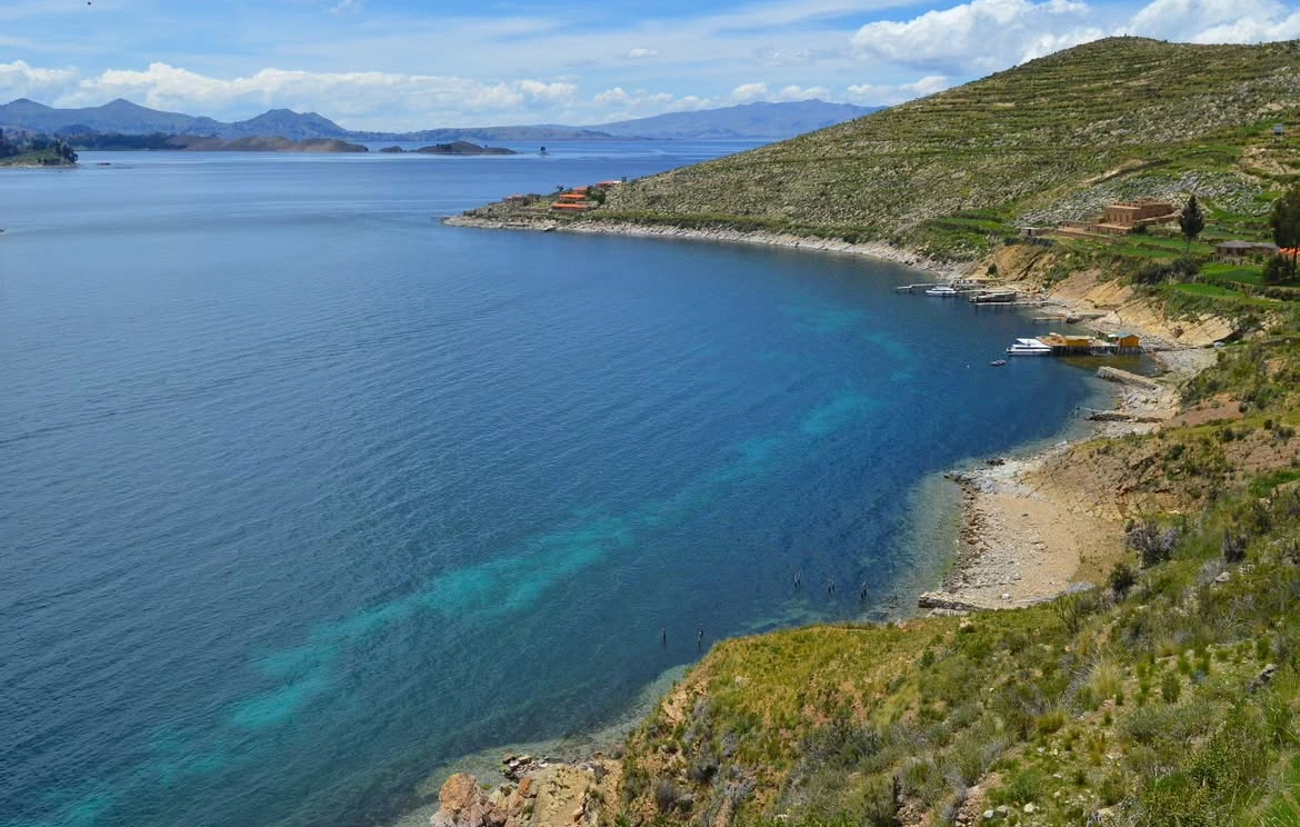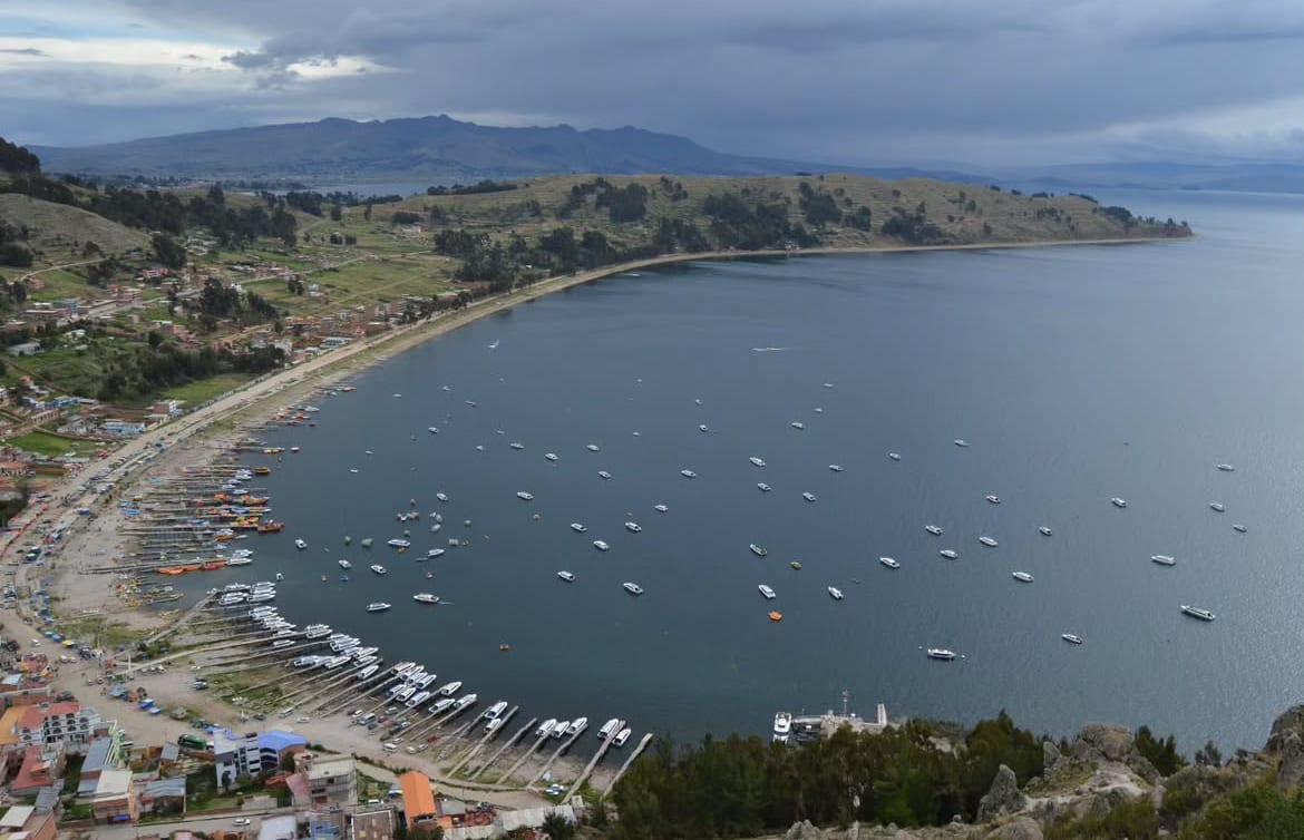 El bus partió de la terminal junto al cementerio general de La Paz cuando el sol apenas comenzaba a iluminar las cumbres nevadas. Cinco horas después, el Estrecho de Tiquina marcó el verdadero inicio del viaje: descendí del minibús y crucé en una lancha mientras el vehículo flotaba en una plataforma rudimentaria. El lago ya se insinuaba con un azul encendido, de esos que parecen más altos que el cielo mismo.