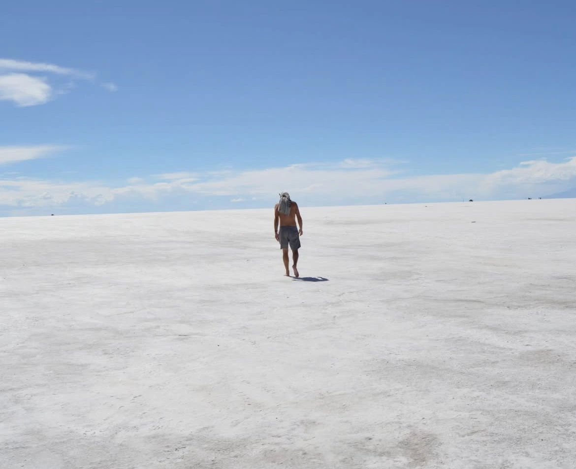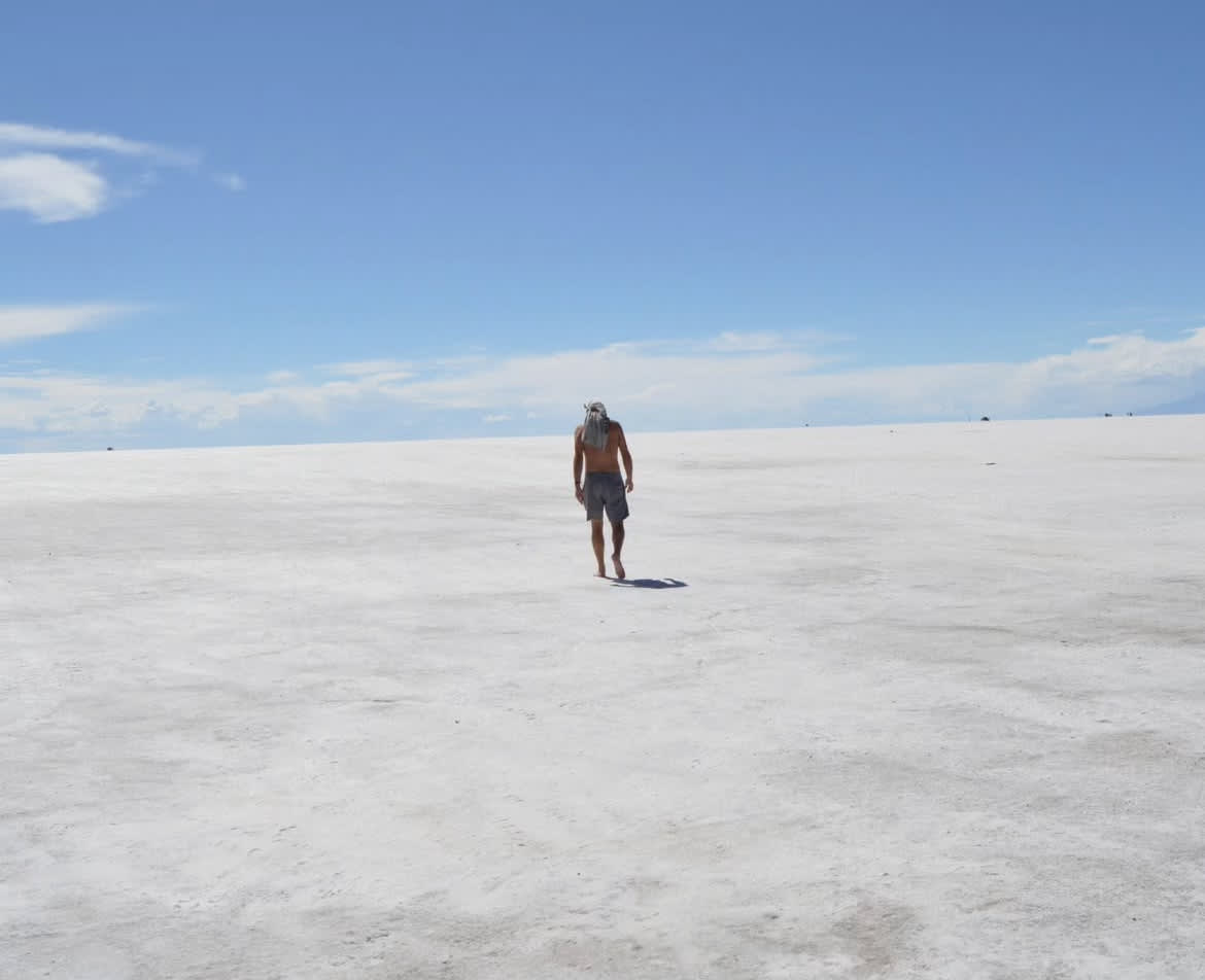 El salar mismo fue otra dimensión. No había horizonte claro: solo una extensión blanca que confundía distancia y escala. Caminar ahí era como estar en un espejo que multiplica el cielo, con la luz golpeando tan fuerte que cualquier descuido lastimaba los ojos. El silencio era total, un vacío sonoro que se volvía casi físico, como si cada paso flotara. El frío del viento, a pesar del sol, marcaba la contradicción constante del altiplano.