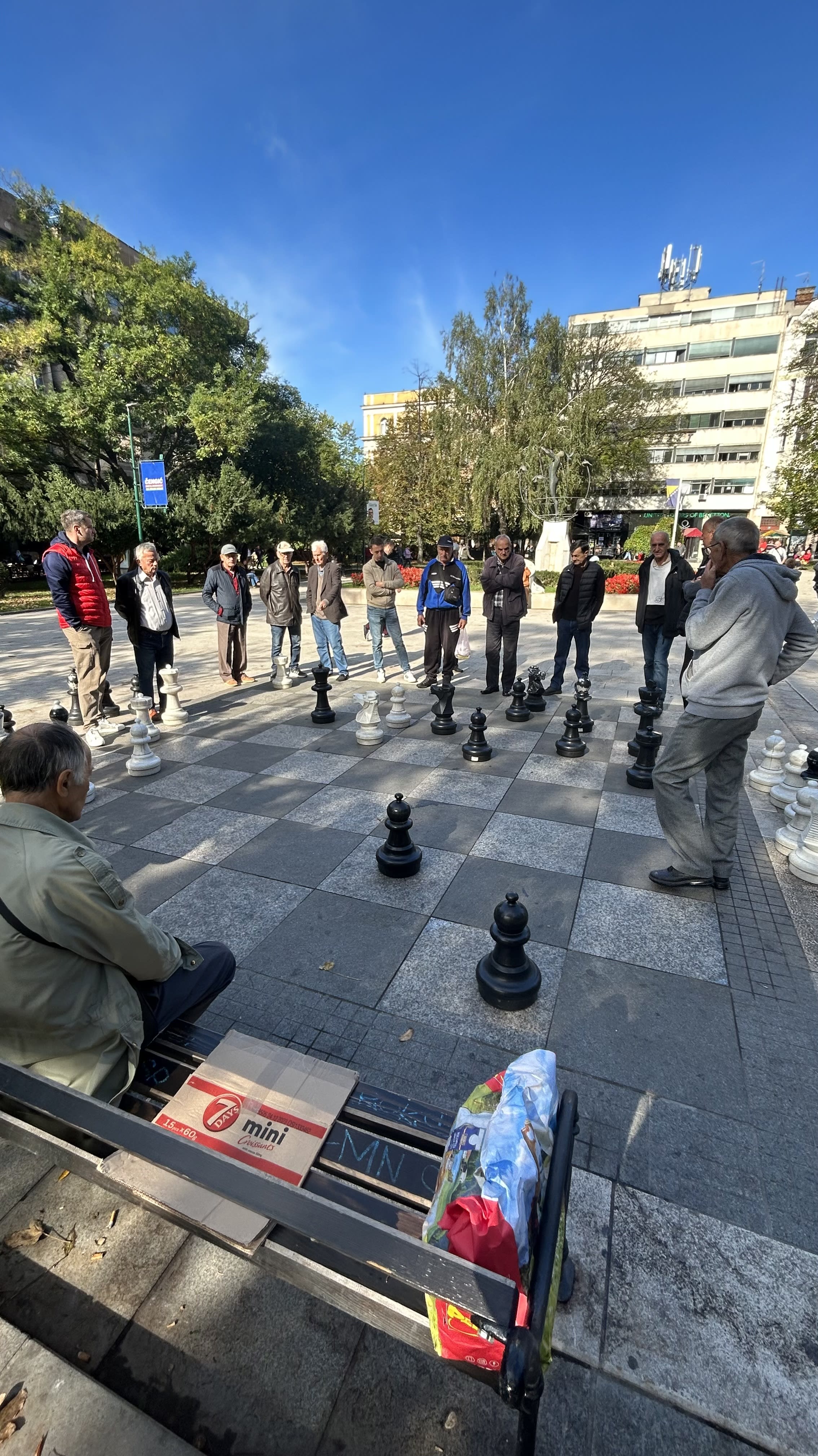 Recuerdo la plaza central, un corazón latente donde la vida se manifiesta de formas inesperadas. Allí, un ajedrez pintado en el suelo se convertía en un espectáculo de pasiones. Piezas gigantescas se movían con una intensidad que era observada por un público que opinaba, discutía y celebraba cada jugada. En ese rincón vibrante de la ciudad conocí a Gerónimo, un argentino que, como yo, se dejaba llevar por los caminos de los Balcanes. Ambos quedamos fascinados por el entusiasmo que ese juego de mesa despertaba. Fue el comienzo de una amistad que, como el juego de ajedrez, nos unió a través de un tablero compartido de experiencias y viajes.