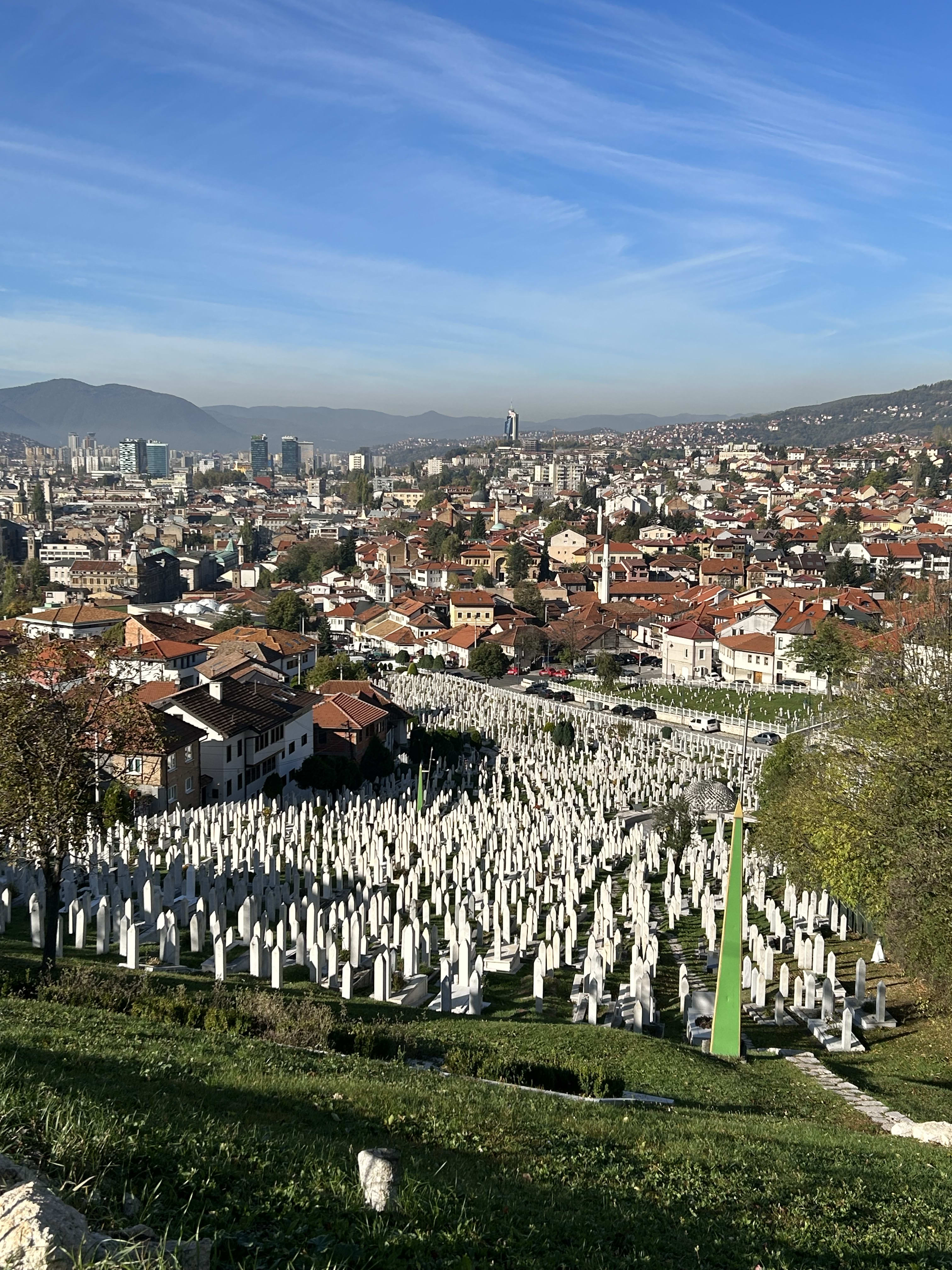 Junto a Gerónimo y a una chica estadounidense, emprendimos un recorrido por las ruinas de la posguerra. Caminamos entre edificios destrozados y encontramos la famosa Sniper Tower. Ese edificio, un antiguo banco, se había transformado durante la guerra en un puesto de francotiradores croatas desde donde se controlaba toda la ciudad. Con la ayuda de unos ladrillos apilados, nos aventuramos en su interior. A medida que subíamos por las escaleras de cemento, nos envolvía una sensación extraña, casi sagrada, y las paredes, repletas de grafitis y arte urbano, se convirtieron en un lienzo de protesta y memoria. Desde el techo, con la ciudad a nuestros pies, sentimos el peso de la historia, la carga de la violencia y la profunda herida que el conflicto dejó atrás.