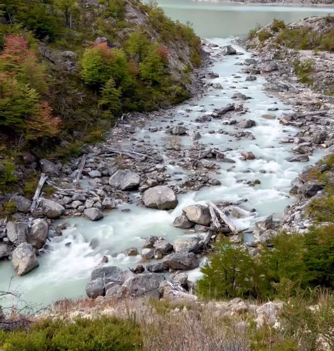 Más adelante, otra unión épica. El Chacabuco, cargado de sedimentos glaciares, teñía de blanco lechoso las aguas del Baker. Aquí el fenómeno era distinto: no una fusión, sino una conquista lenta. El Baker aceptaba las aguas turbias pero seguía su curso imperturbable, como alguien que tolera lo que viene sin dejar que lo cambie.