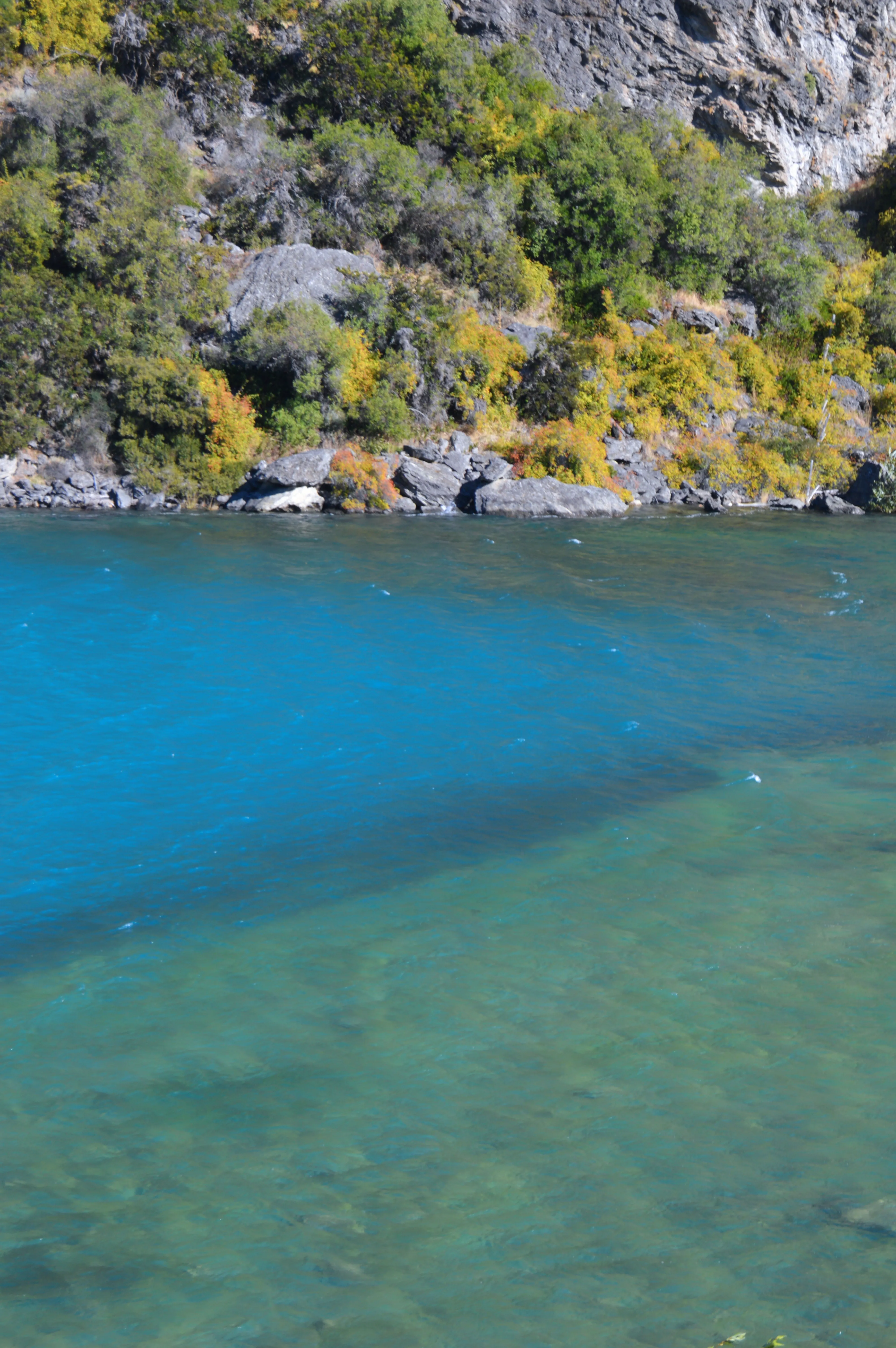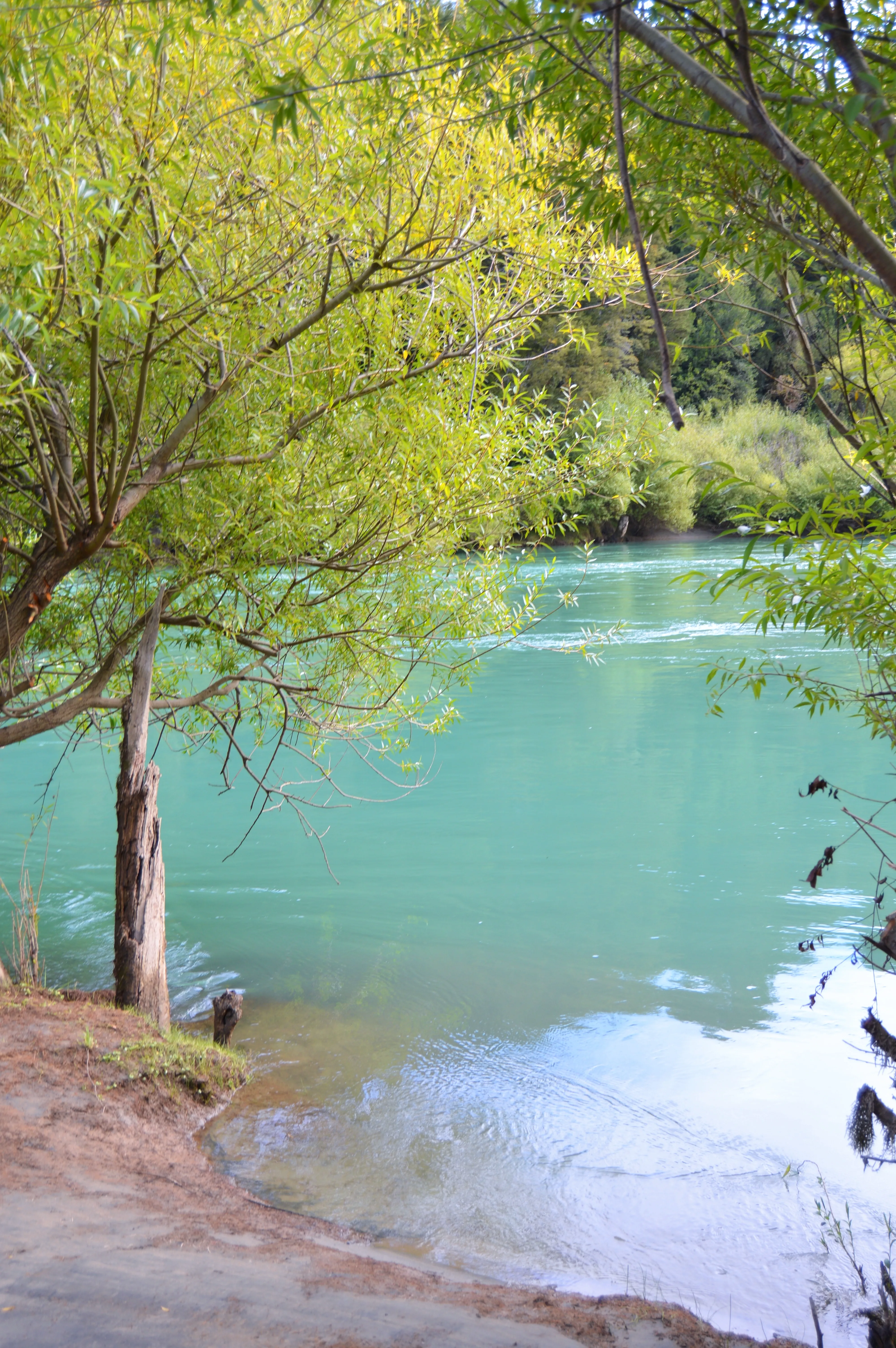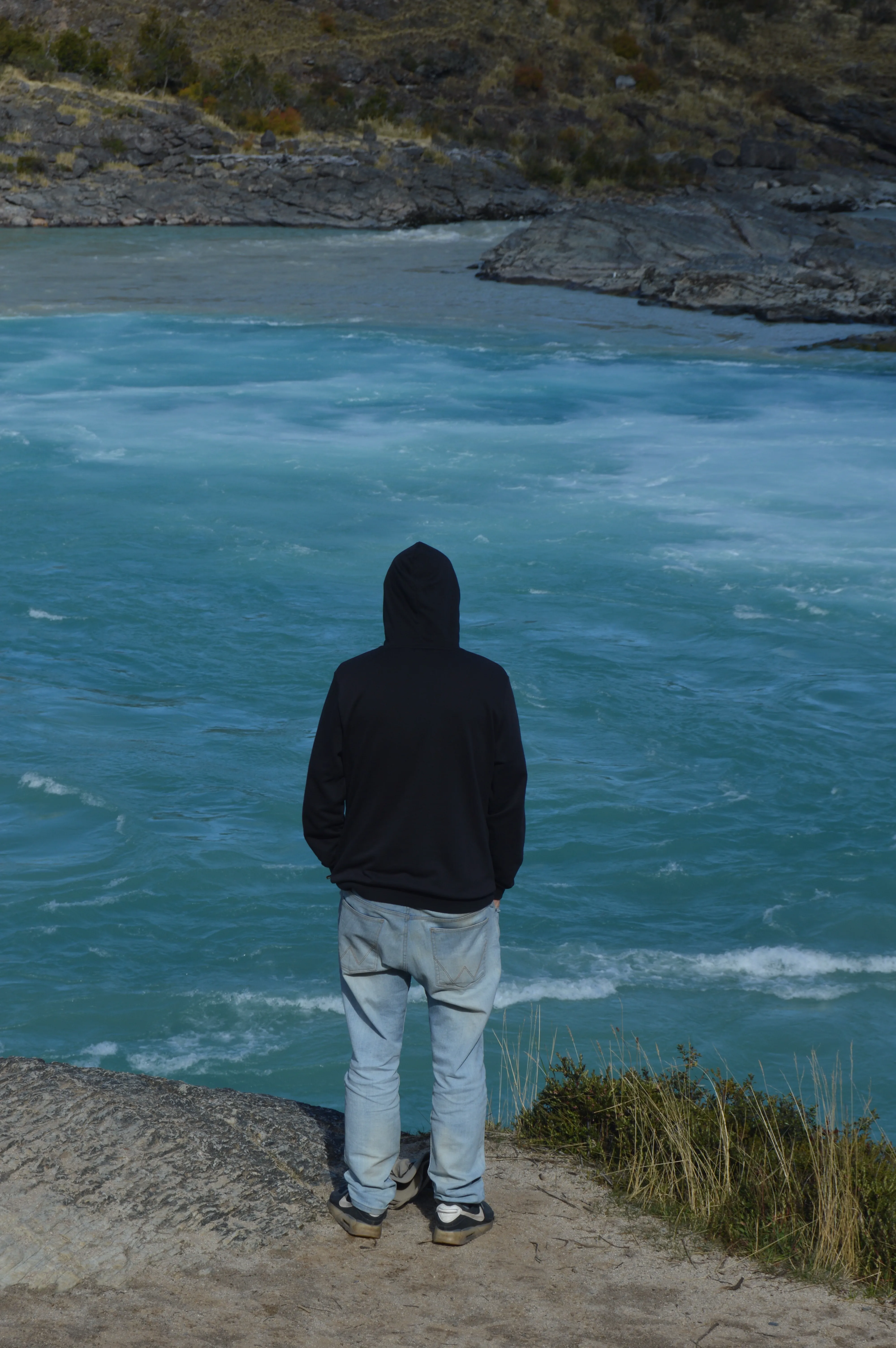 Aparcamos en un pequeño desvío y caminamos los seiscientos metros que separaban la ruta del punto exacto donde el Nef entrega sus aguas al Baker. El contraste era hipnótico: el Nef, de un azul profundo casi negro, chocando contra el turquesa eléctrico del Baker. En el punto exacto de unión, las corrientes se trenzaban creando un remolino de espuma y, por unos metros, un tercer color nacía de la mezcla: un verde esmeralda que solo existía ahí, en ese instante.