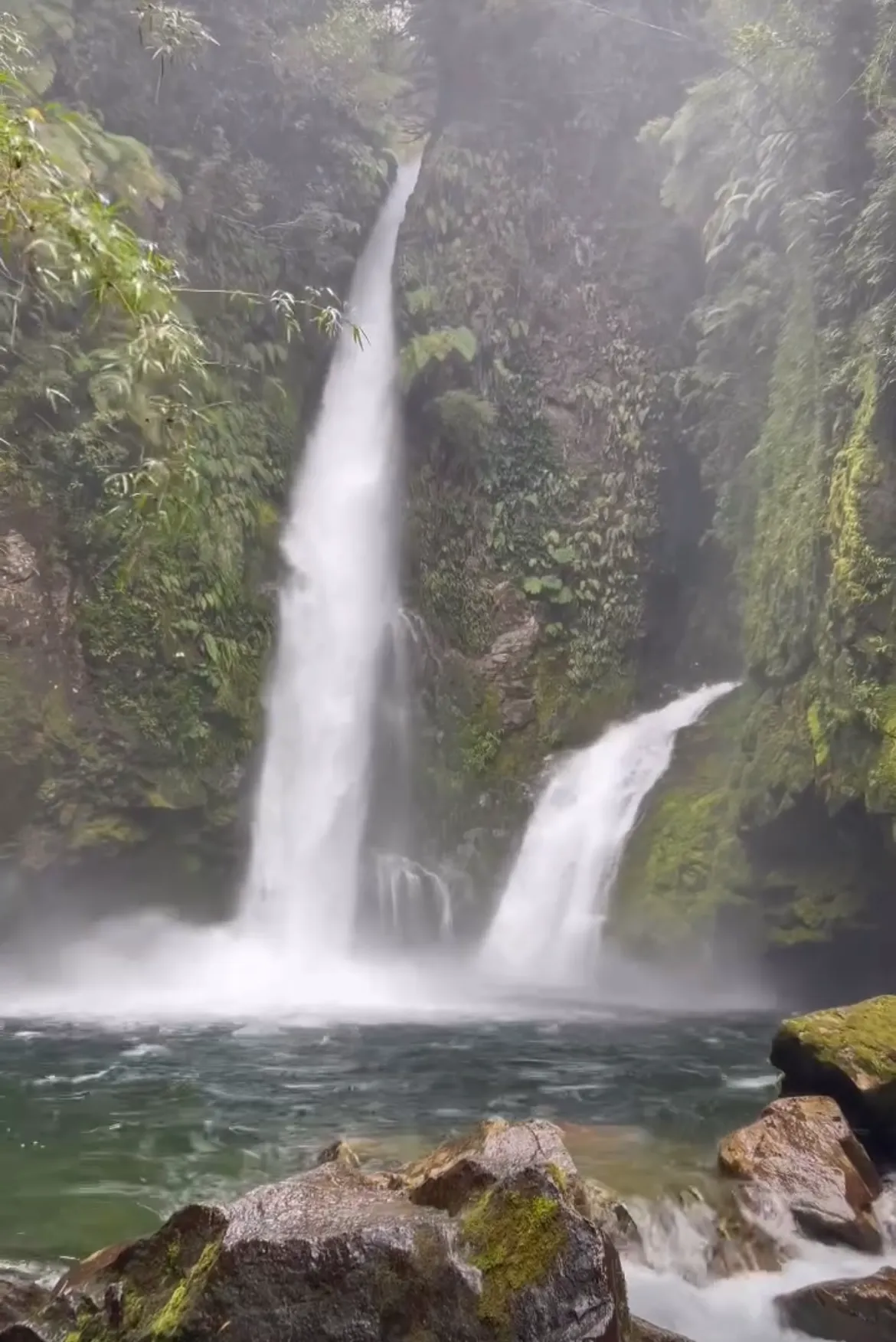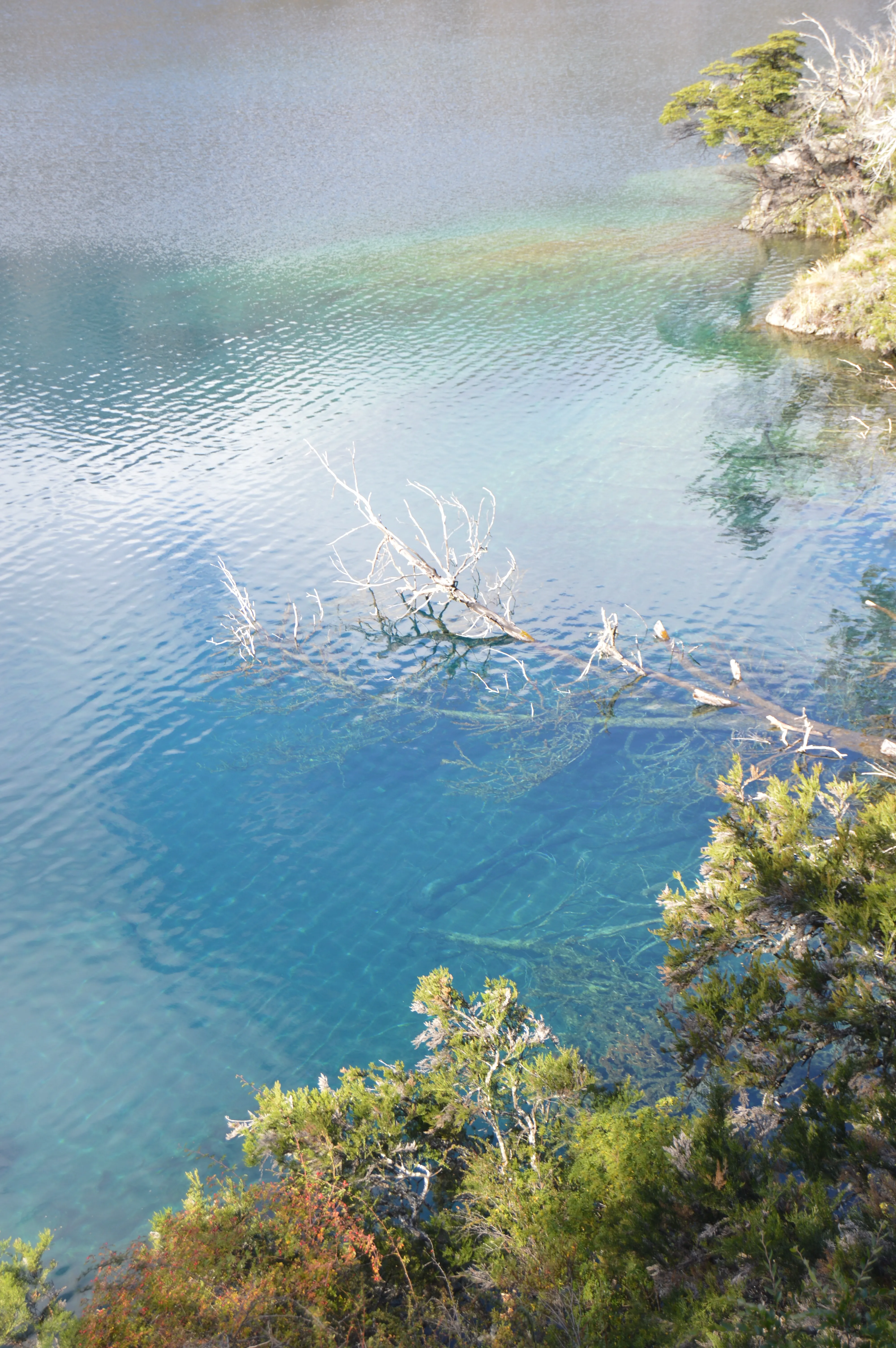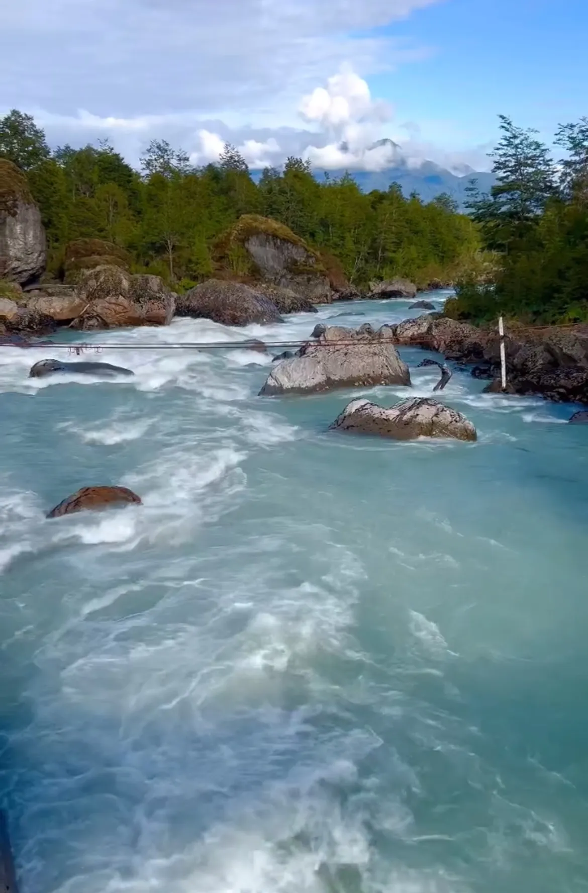 Aparcamos en un pequeño desvío y caminamos los seiscientos metros que separaban la ruta del punto exacto donde el Nef entrega sus aguas al Baker. El contraste era hipnótico: el Nef, de un azul profundo casi negro, chocando contra el turquesa eléctrico del Baker. En el punto exacto de unión, las corrientes se trenzaban creando un remolino de espuma y, por unos metros, un tercer color nacía de la mezcla: un verde esmeralda que solo existía ahí, en ese instante.