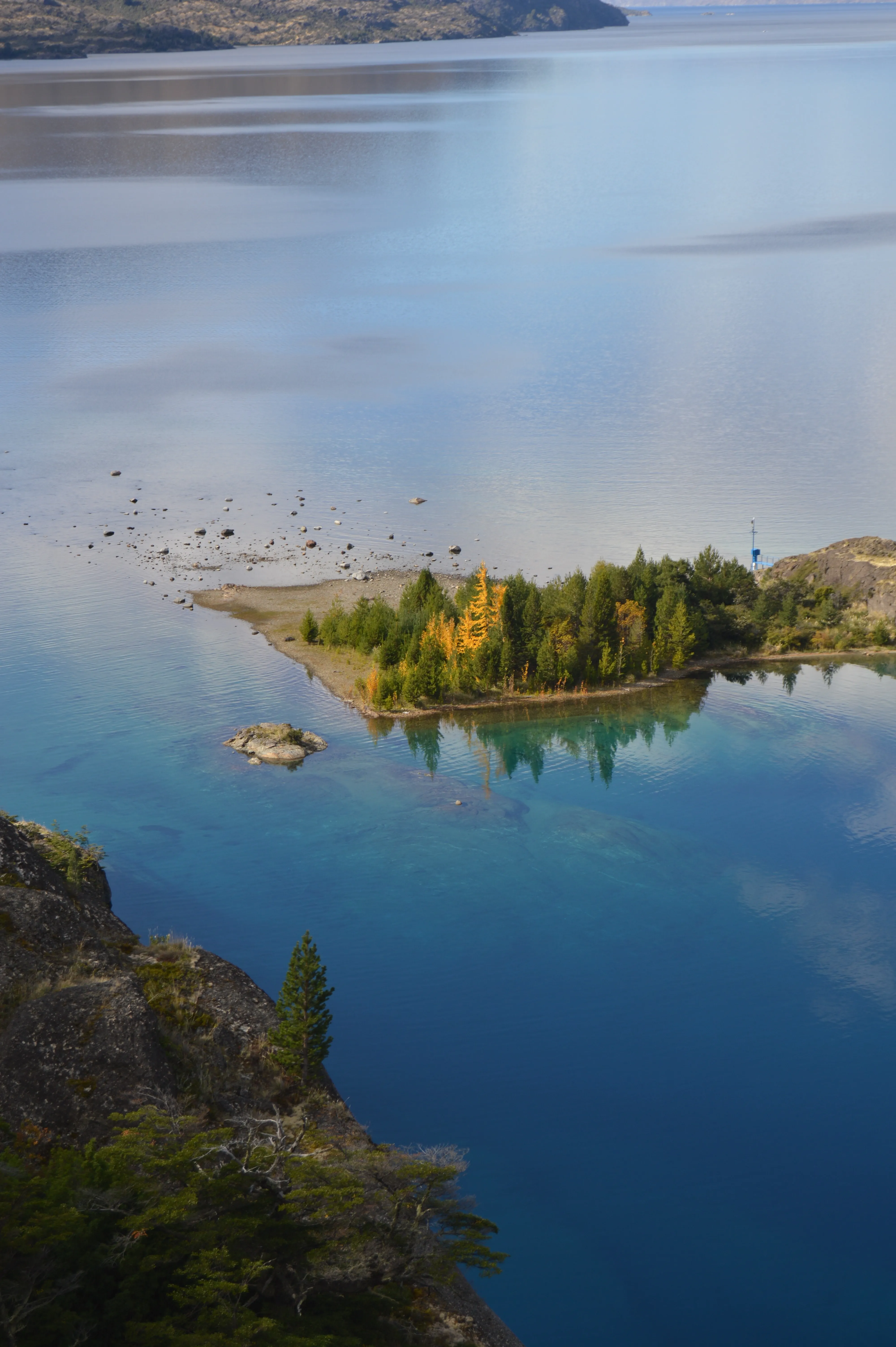 Llegué a un Puerto Río Tranquilo casi desierto. Marzo ya era otoño acá, y los pocos negocios abiertos tenían ese aire resignado de quienes saben que el invierno se acerca. El camping donde me instalé era un mundo en sí mismo: carpas dispersas entre árboles que empezaban a perder sus hojas, un silencio solo roto por el graznido ocasional de alguna ave lacustre, y los baños con esas duchas que prometían agua caliente pero siempre entregaban solo tibieza.