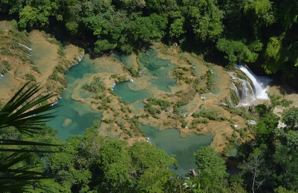 Entonces apareció Semuc: una lengua de travertino que el río Cahabón fue labrando hasta formar piscinas naturales alineadas, escalones de agua que brillaban como vidrio verdiazul. Caminar entre las pozas es andar sobre la obra lenta de la piedra; el murmullo del agua, las paredes calcáreas y los islotes diminutos forman una topografía que obliga a parar la prisa. El color del agua cambia con la luz: a veces se torna casi celeste, a veces adopta un tono profundo que parece contener todo lo que la selva calla.