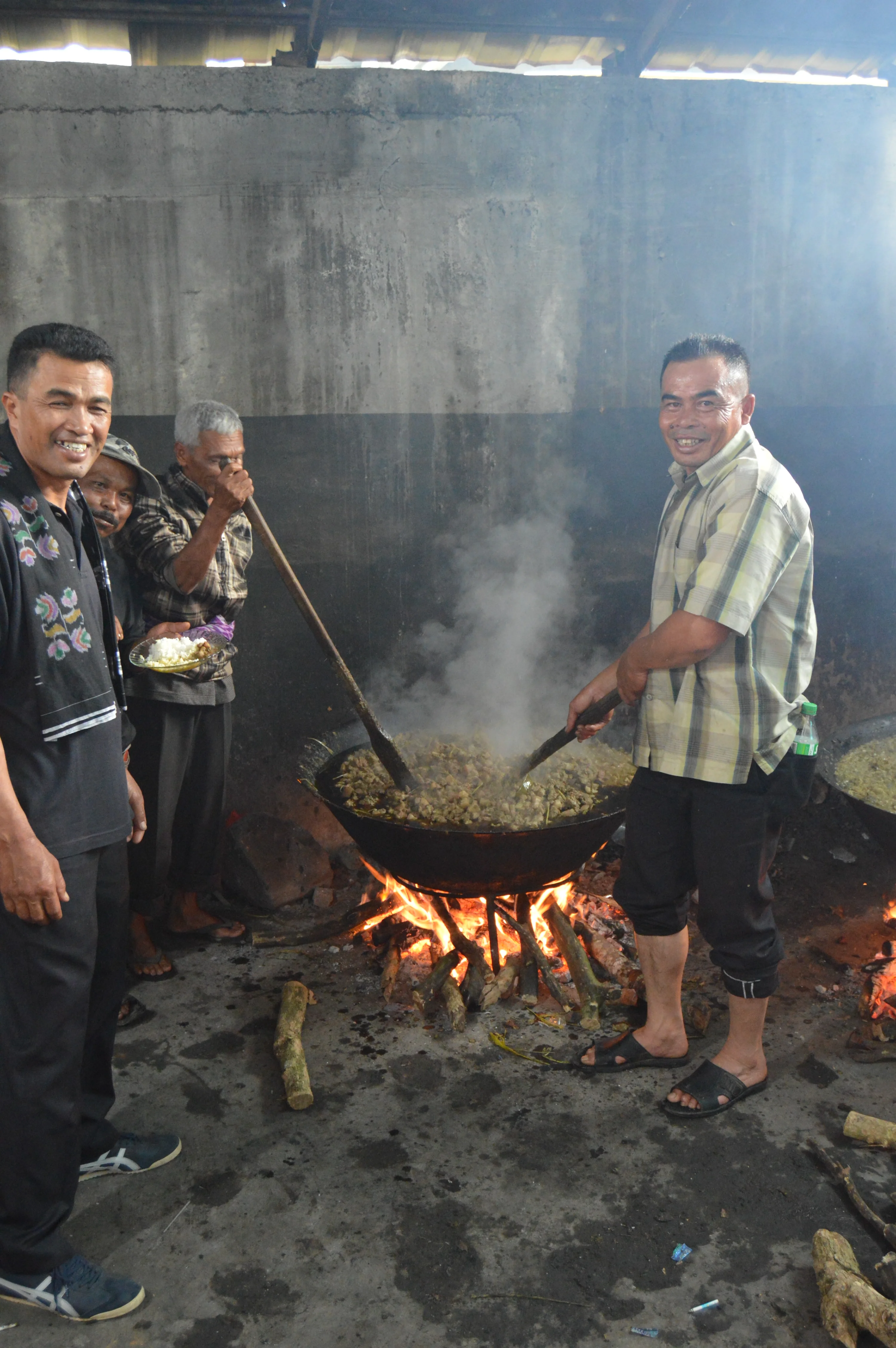 El funeral batak enseña otra dimensión: la muerte como evento social. No se oculta ni se suaviza: se celebra, se documenta y se filma. En mi paso por Brastagi ayudé en la cocina de uno de esos velorios —había unas doscientas personas y calderos gigantes de babi panggang humeando como motores colectivos—. Revolvía con cucharones enormes y luego ayudaba a repartir platos. Lo sorprendente era la sonrisa de todos, la gratitud sincera de compartir su cultura conmigo; parecía que estaban más contentos que yo de que fuera parte de aquello.