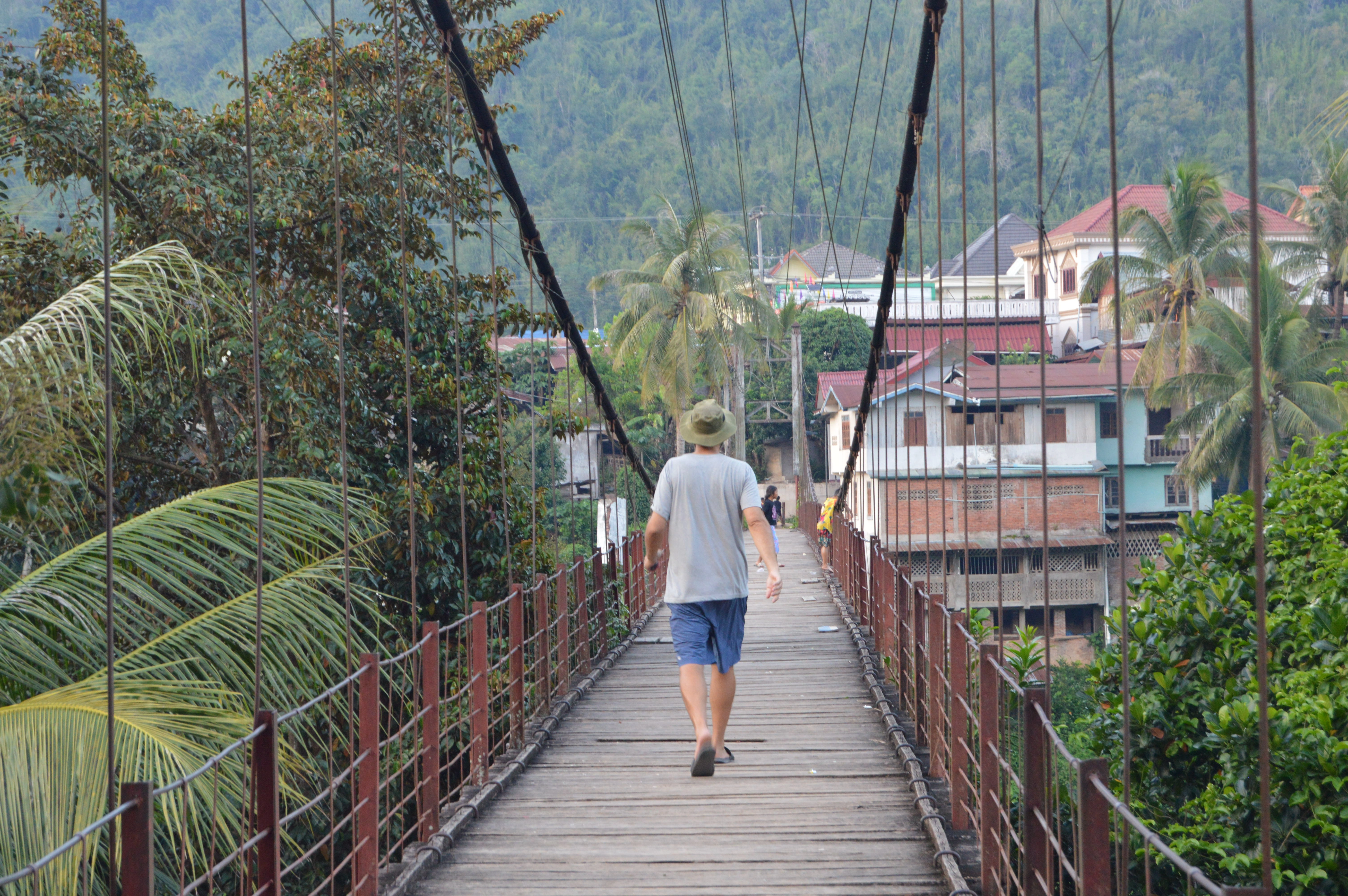 Dormí en una guesthouse barata y tranquila, con el ventilador girando lento y el sonido apagado del Nam Ou filtrándose por la ventana. Al amanecer, salí a caminar otra vez. El río no era hermoso en el sentido clásico: no tenía jungla cinematográfica ni montañas afiladas detrás. Pero mezclado con la vida cotidiana del pueblo —los puestos callejeros, los vecinos preparando la comida, los niños cruzando el puente camino a la escuela— tenía un encanto difícil de explicar. Como si la belleza se construyera más en la convivencia que en el paisaje.