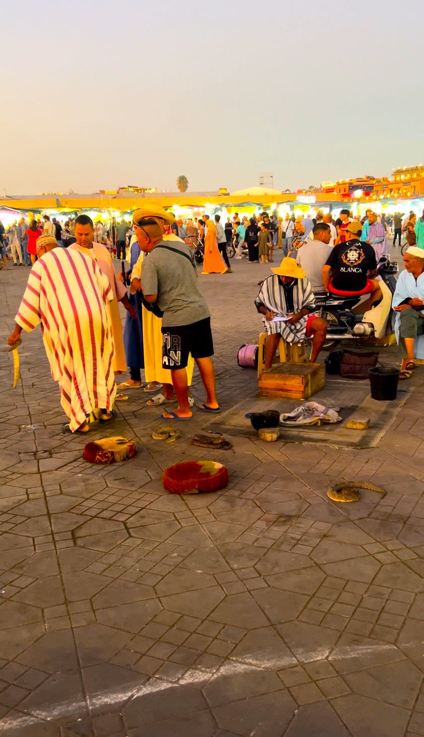 El espectáculo de las serpientes es, quizás, la cara más oscura de esa función. Los hombres las sacan de cajas estrechas y las fuerzan a moverse al ritmo de una flauta, pero no hay magia en la música, solo miedo en el animal. Los ofidios, exhaustos y desorientados, apenas levantan la cabeza como si siguieran una coreografía aprendida a golpes. El círculo de forasteros rodea la escena con sus cámaras, sin notar —o sin querer notar— que lo que presencian no es exotismo sino crueldad. Esa visión se me clavó como una espina, un recordatorio incómodo: en Marrakech, no todo lo pintoresco es inocente.