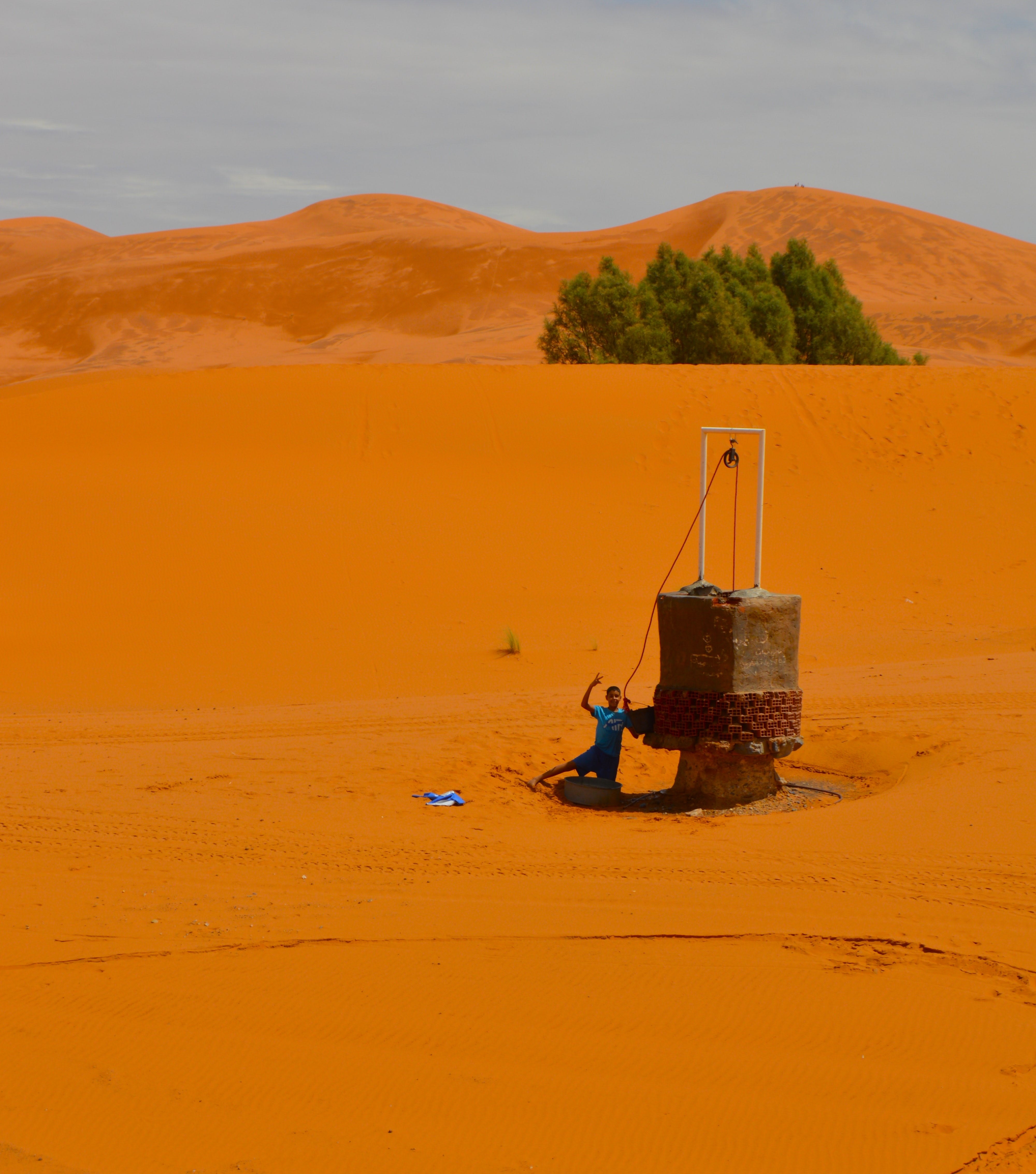 Merzouga se alzó al final de la carretera como una fantasía de adobe, un espejismo de edificios bajos pegado al flanco de un mar de dunas quietas. El bus me dejó a las seis de la mañana. Mi anatomía era un puro calambre después de doce horas enquistado en un asiento. La quietud del lugar era tan profunda que el ronroneo de un generador sonaba a herejía.
