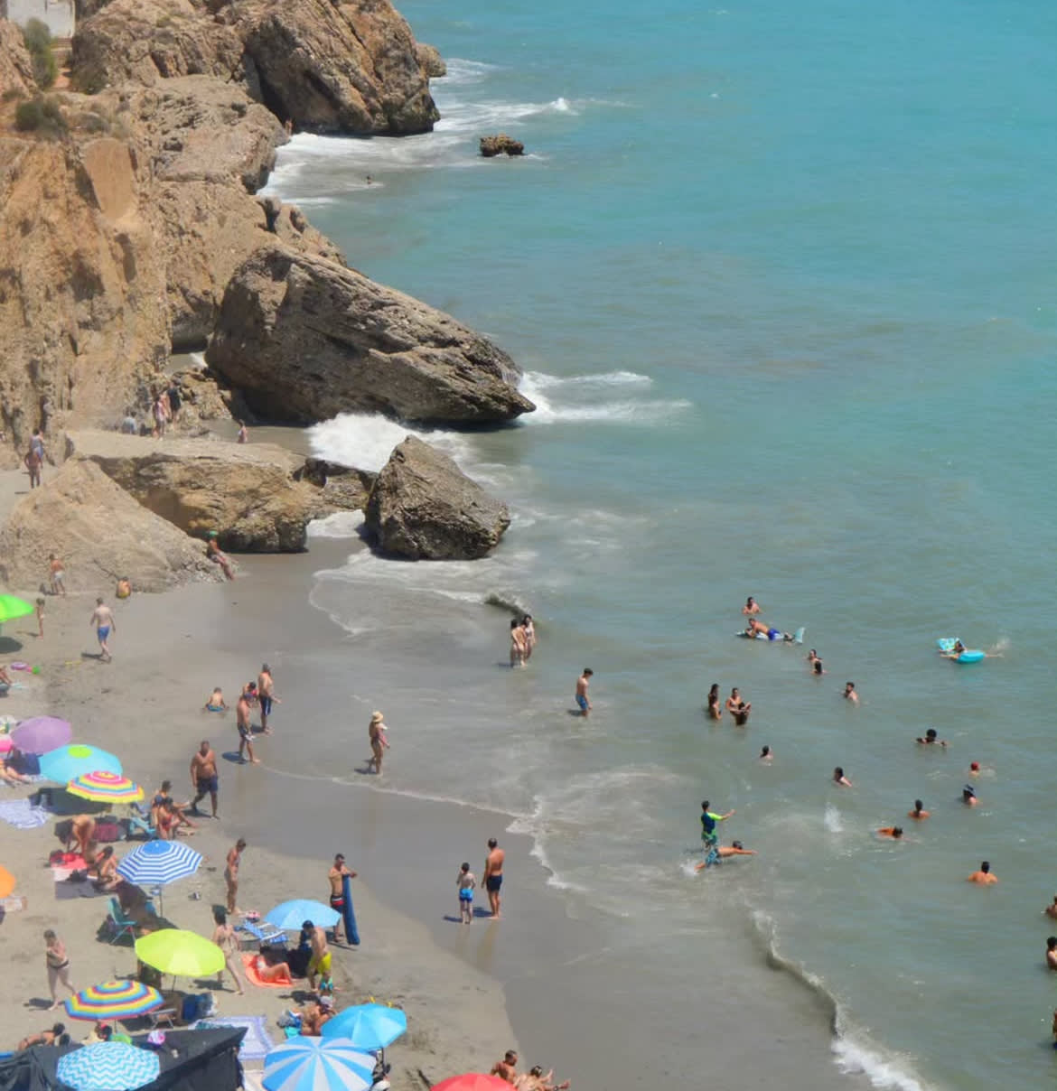 Las tardes pertenecían a Cala Torre del Pino, grieta entre acantilados donde el Mediterráneo tallaba cuevas como catedrales líquidas. Jessica, la brasileña del hostel con sonrisa de caipiriña y un carro que tosía en las cuestas, me descubrió Las Alberquillas: playa destinada bipolar si las hay; por un lado jubilados, y por el otro comunidades hippies que leían a Castaneda y escuchaban a Peter Tosh. El agua era tan transparente que podías contar las estrellas de mar en el fondo. Un día, entre risas y mates compartidos, encontramos grafitis del siglo XIX en una gruta: iniciales de contrabandistas -eso nos informaron luego en el pueblo- que burlaban a la guardia costera. Nerja guardaba secretos bajo su disfraz de postal turística.