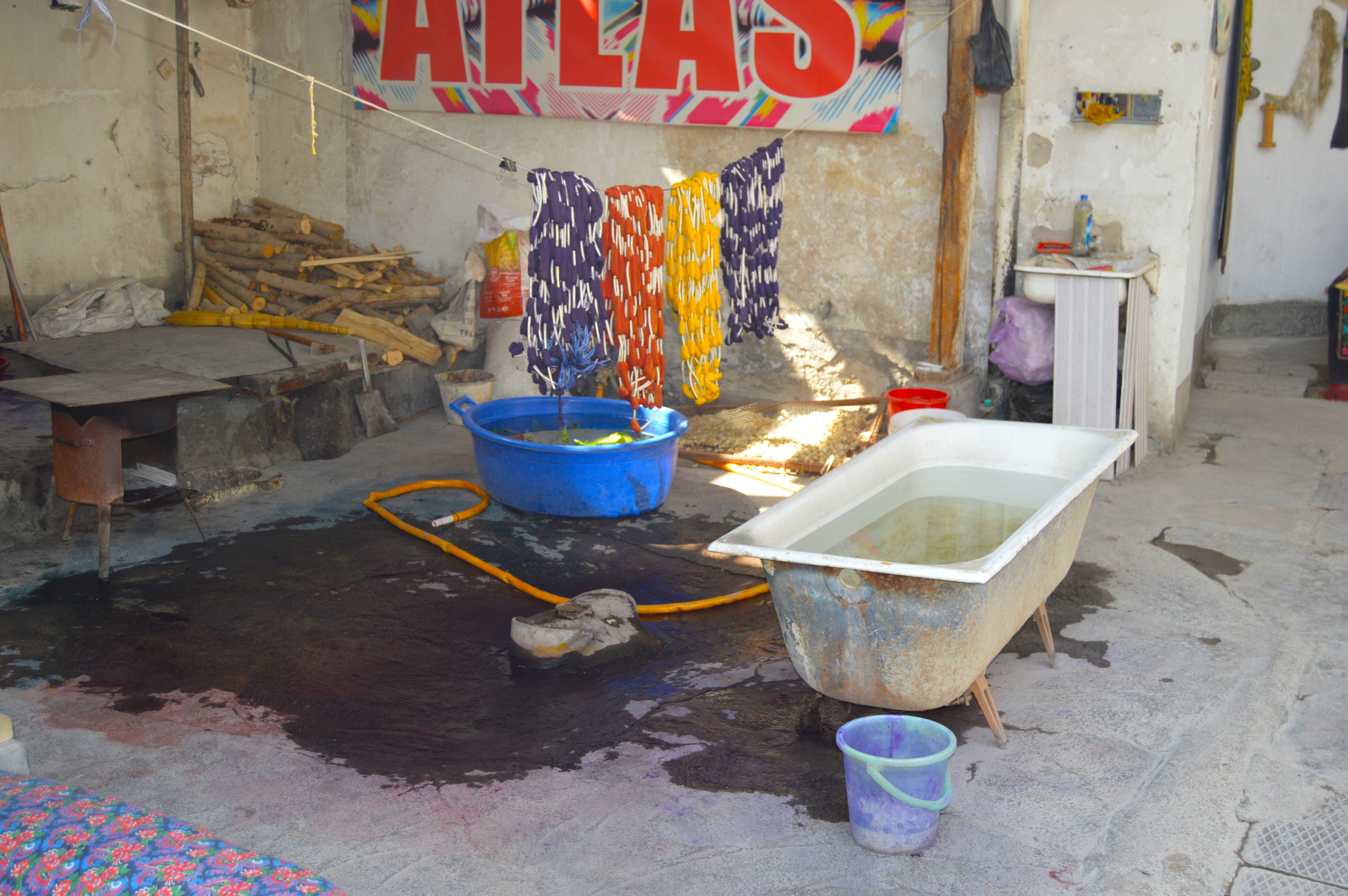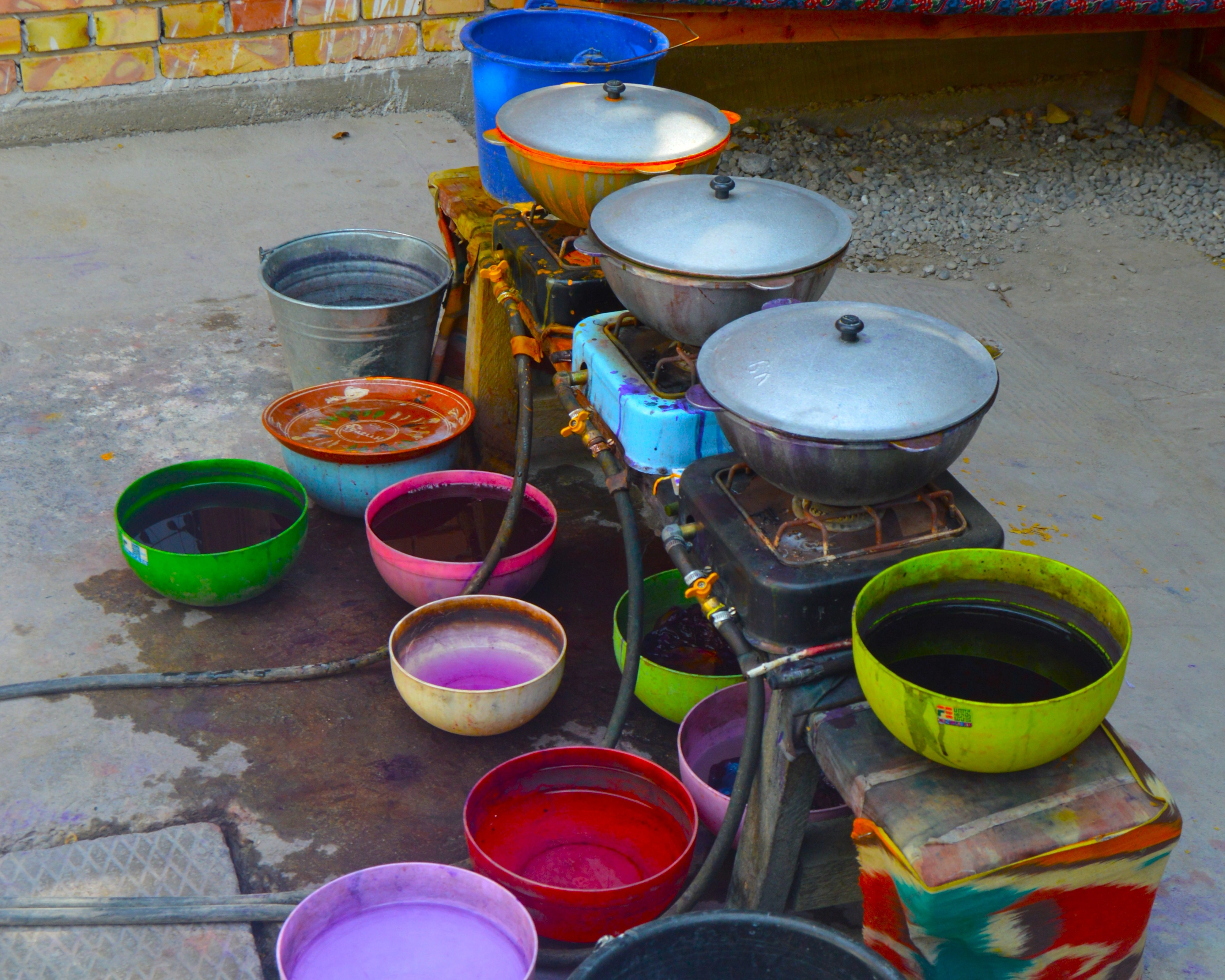 Seguí caminando por Margilan tratando de encontrar la parte que no estuviera programada. Y apareció sola. Un pibe me ofreció una visita “gratuita” a otra fábrica de seda. Fui, sin expectativas. Ahí encontré lo que faltaba: adolescentes mezclando tintes, calentando agua a la intemperie, tiñendo telas con técnicas improvisadas, jugando mientras trabajan. Había dos franceses; les ataron nudos a una tela y después la sumergieron en los recipientes. Salió convertida en la bandera de Francia. Cuando preguntaron por mi nacionalidad, les dije que con el sol de la bandera argentina no había forma de reproducir nada. Nos reímos. Charlamos. Les importaba más hablar que vender.